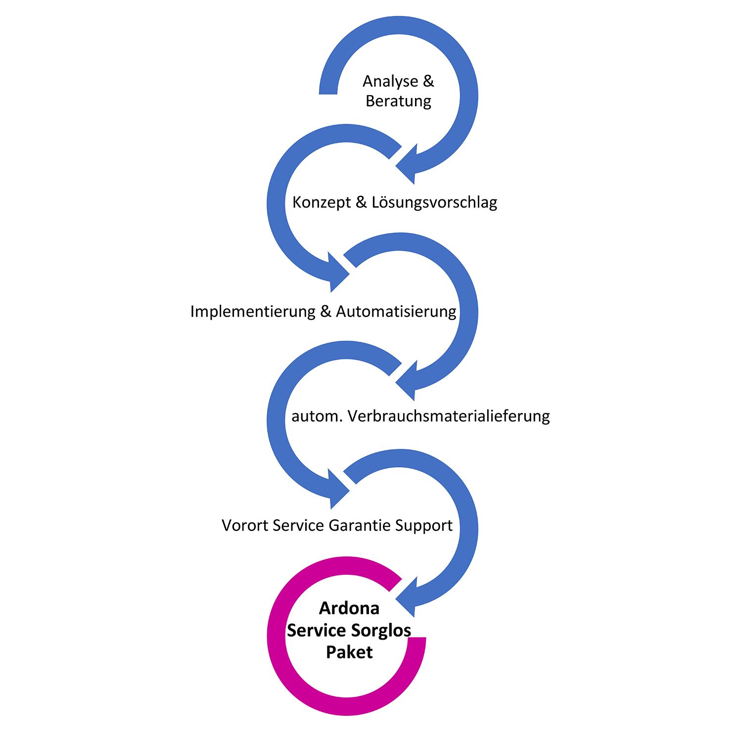 Bei uns erhalten Sie alles aus einer Hand. Wir analysieren, beraten, liefern, installieren, implementieren, automatisieren und kümmern uns zudem darum, dass Ihre Geräte stets einwandfrei funktionieren. Wir liefern Ihnen sämtliches Verbrauchsmaterial vollautomatisiert und kümmern uns bei Bedarf um eine allfällige Störungsbehebung.